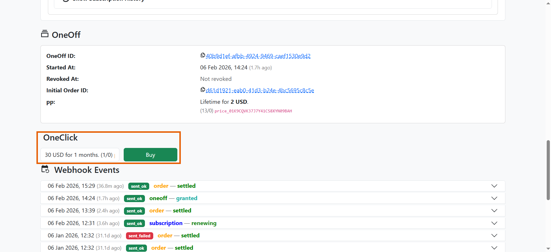 One-offs grant lifetime access. All transactions also appear under the Payments section along with subscription payments. Purchased one-offs are displayed under OneOff below.