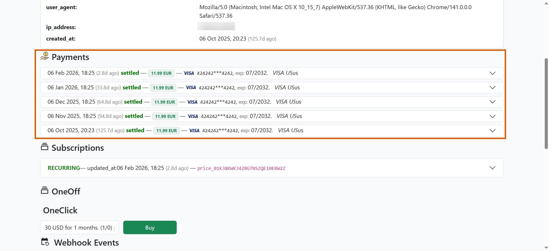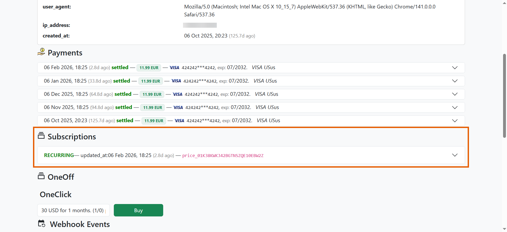 Purchased subscriptions are displayed under Subscriptions. All payments are linked to active subscriptions and show the billing iteration in the metadata.