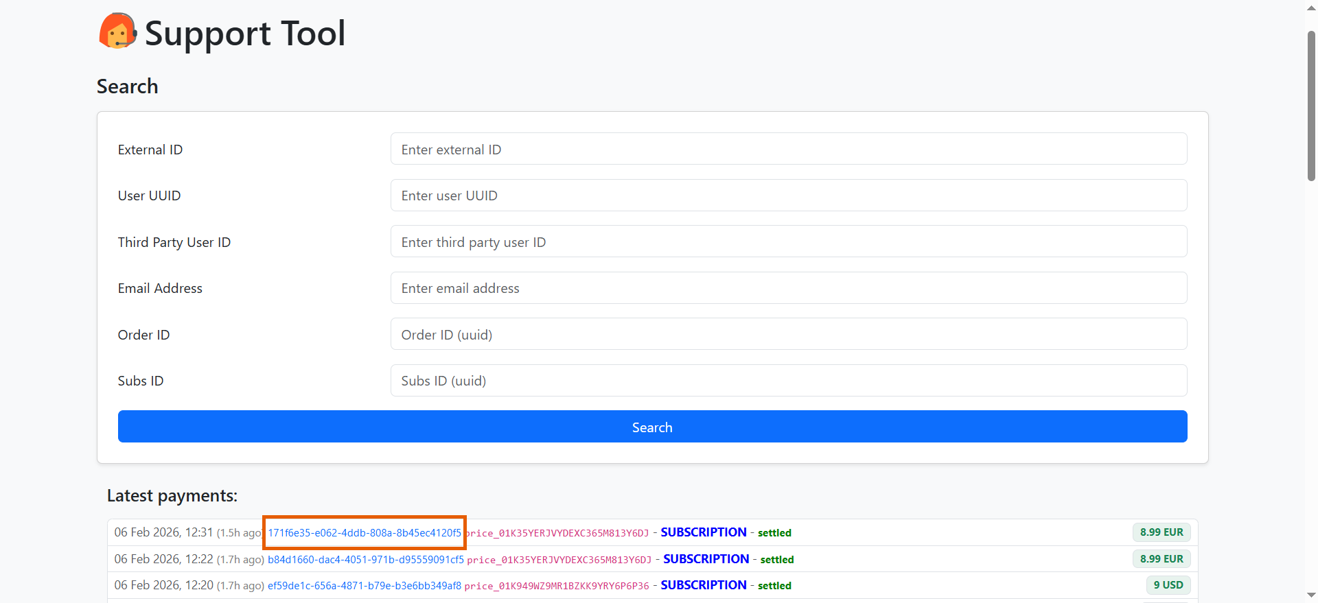 1. Go to the Support Tool page of your FunnelFox Billing dashboard. The latest payments appear below.