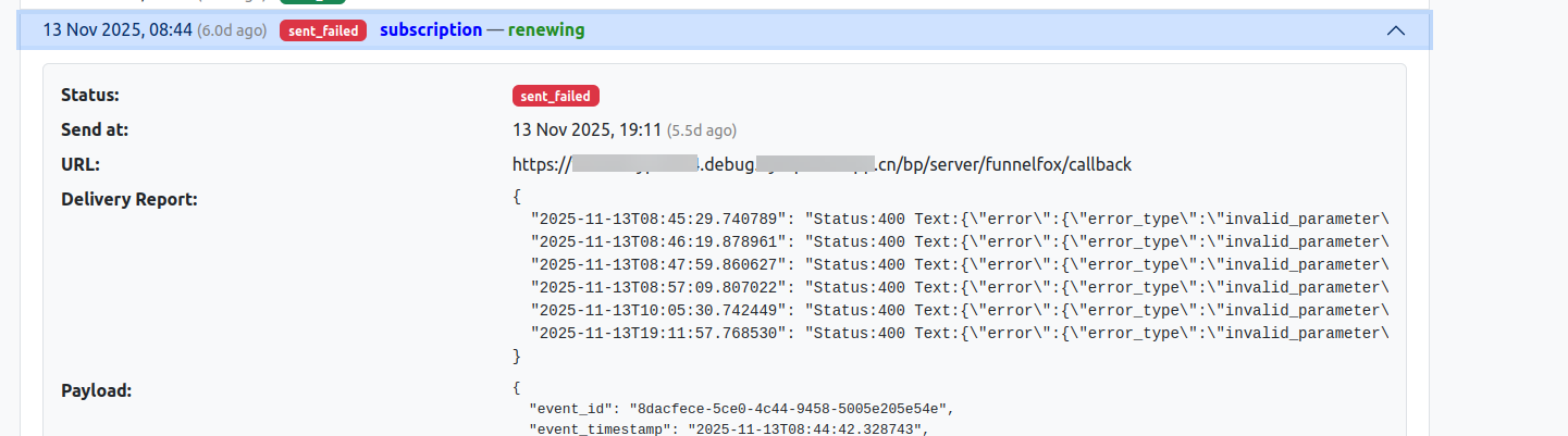 If delivery fails (for example, your server is unavailable or returns a non-2xx status), we retry up to 6 times with exponential backoff. Intervals are in seconds, with the last wait about 72 hours (configurable per merchant):