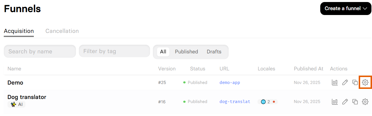 The Funnels page has two tabs: Acquisition and Cancellation. Both funnel types use the same editor and features but serve different purposes in your customer journey.- Acquisition