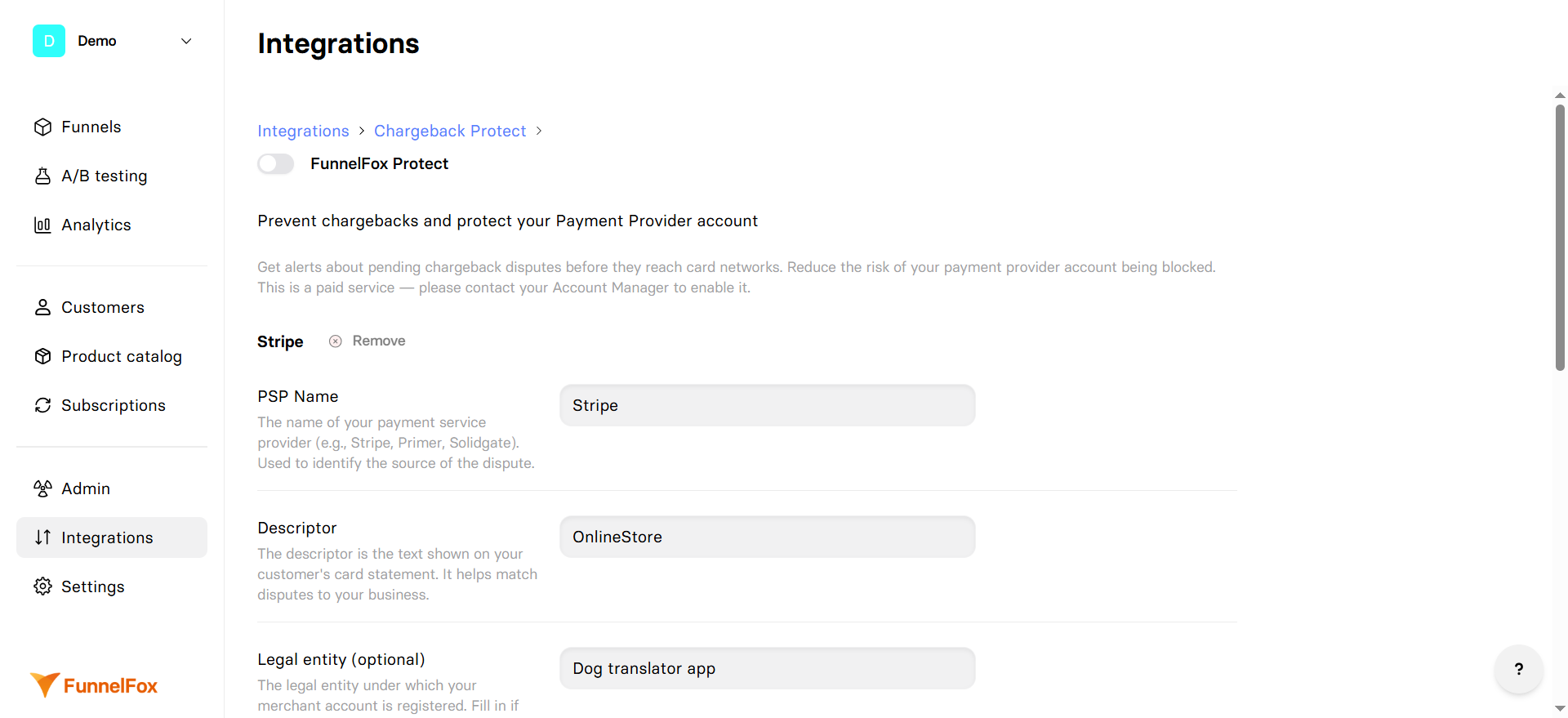 To start protecting your merchant account, you need to enable the service and configure your payment provider details. This allows FunnelFox Protect to monitor and respond to disputes automatically.- Ask your Customer Success Manager to enable FunnelFox Protect.