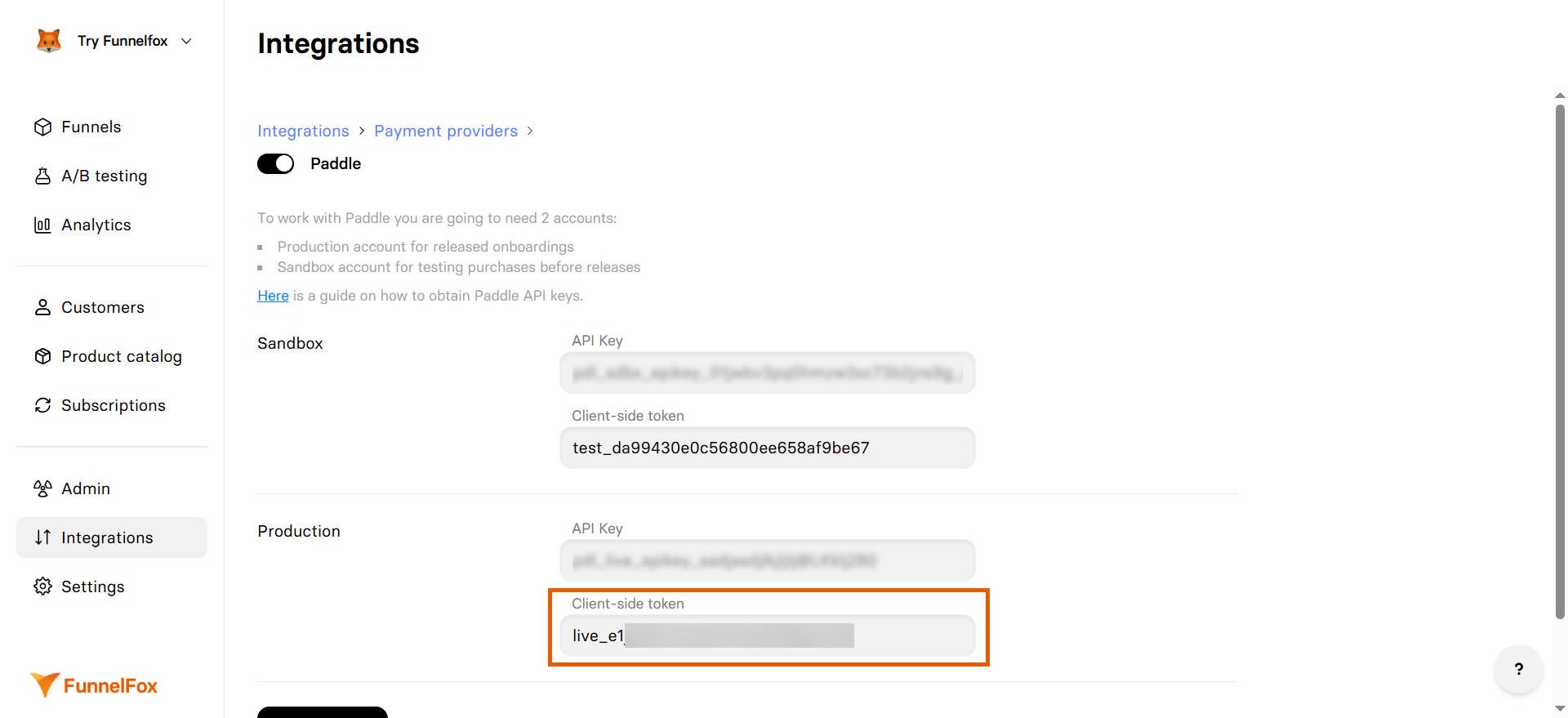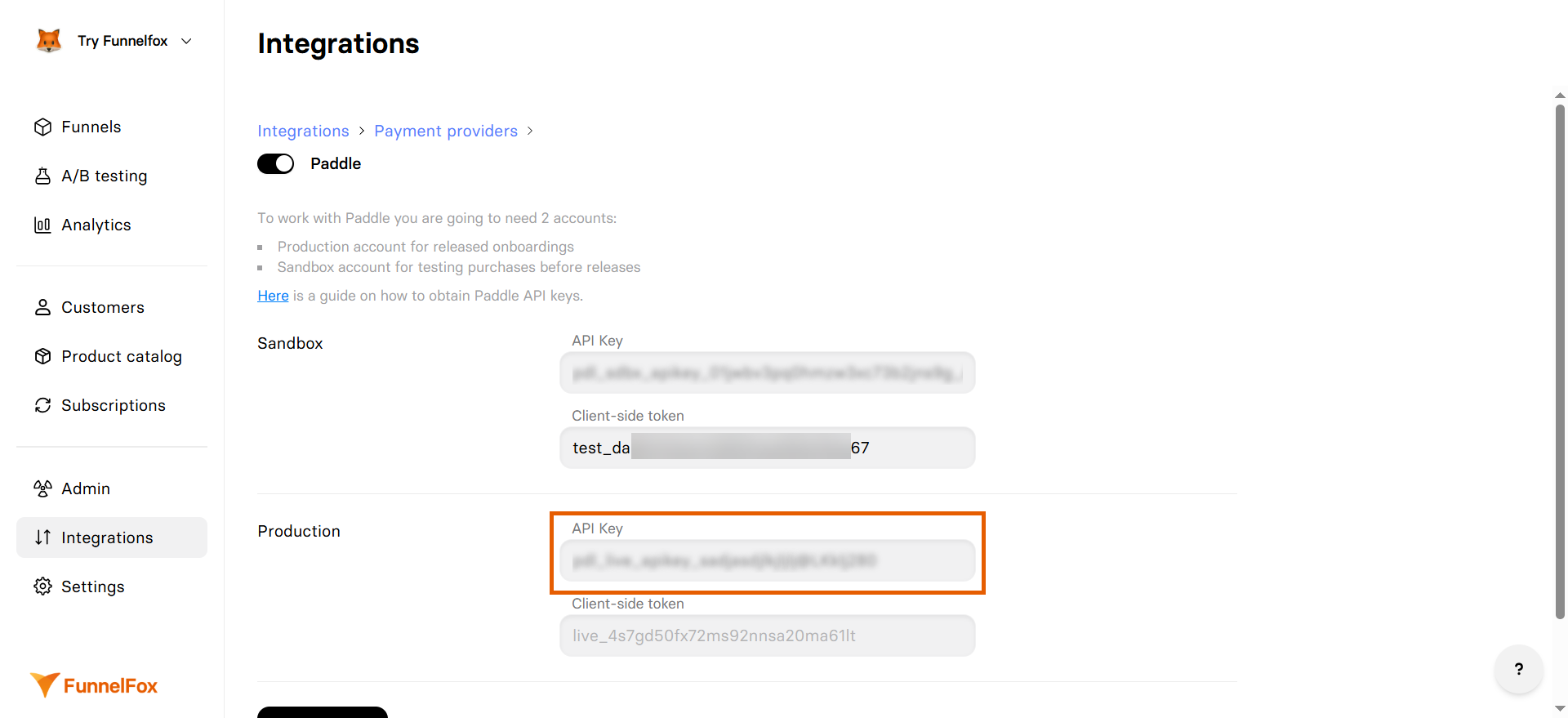 - Use the Sandbox fields instead of Production fields when pasting keys in FunnelFox.