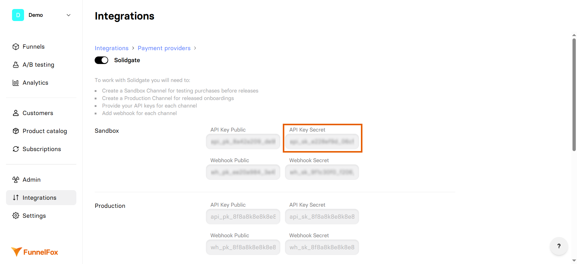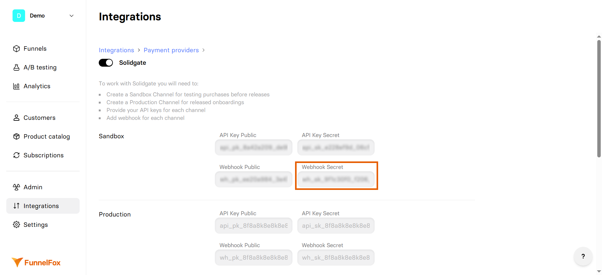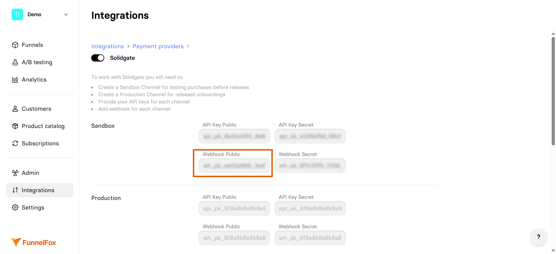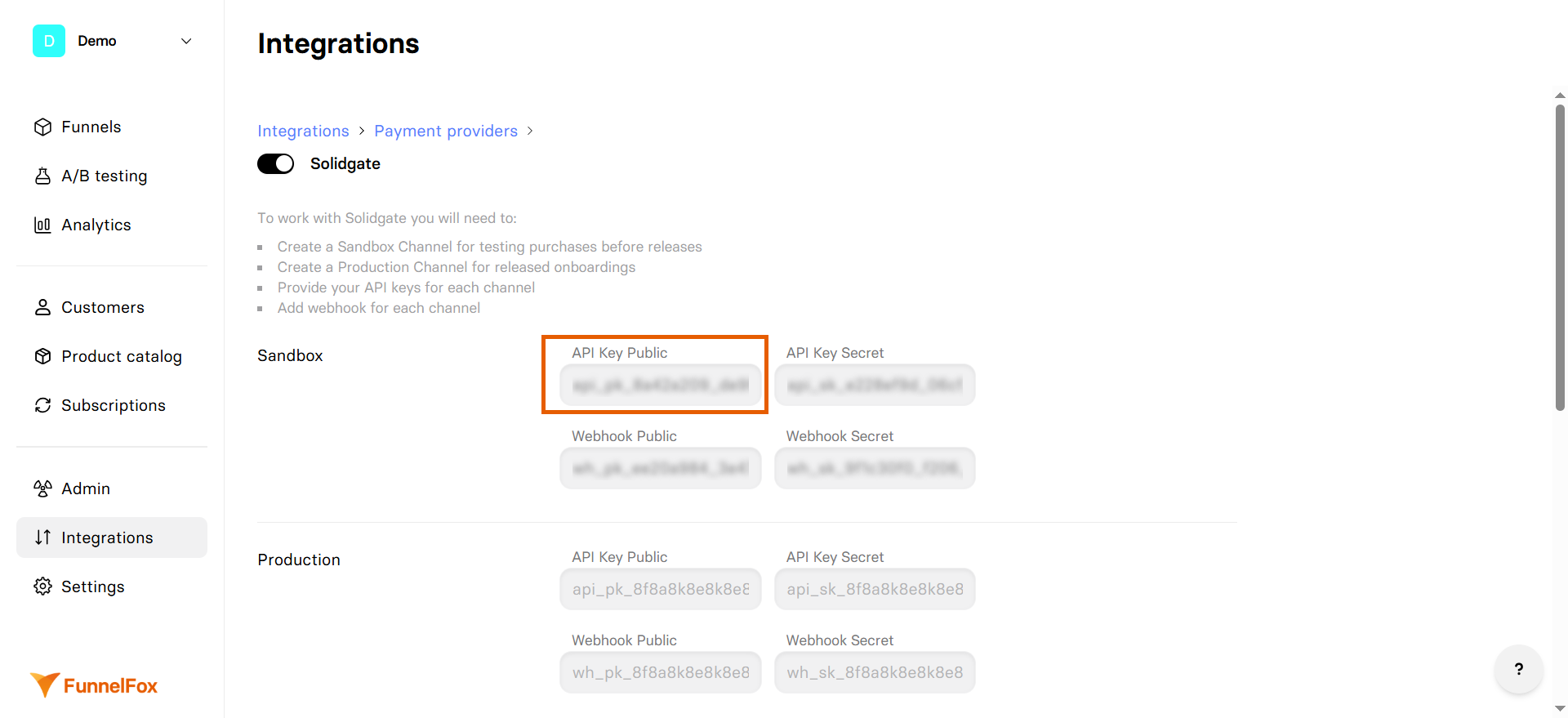 Don’t close your Solidgate integration settings in FunnelFox and proceed with the next section.