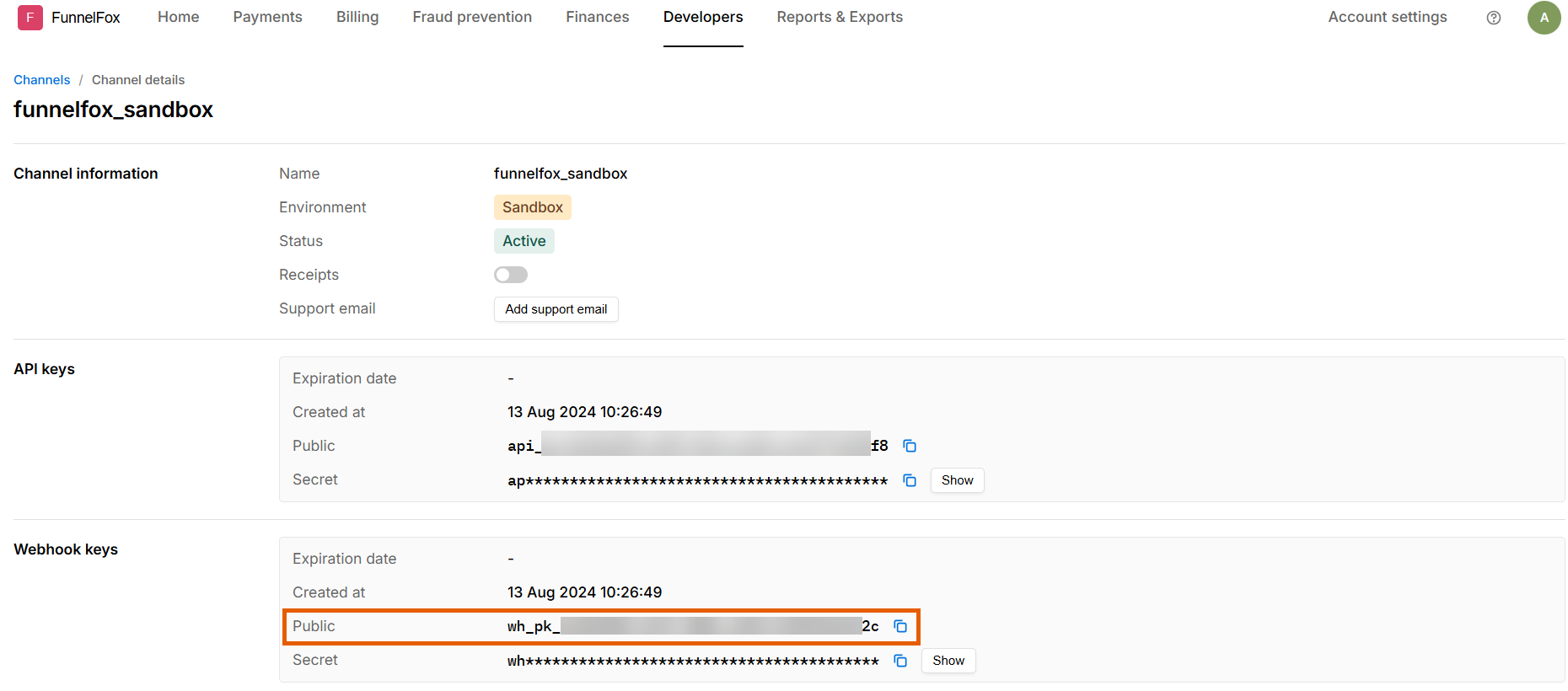 - Paste the Public key into the Webhook Public field under Sandbox.