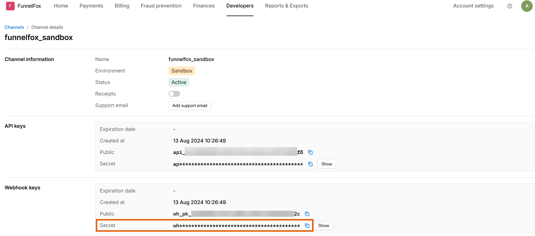 You need two active and verified channels (Sandbox and Live) available in Developers > Channels in your Solidgate Dashboard to integrate with FunnelFox. Keep both FunnelFox and Solidgate dashboards open during setup—you’ll switch between them several times.1. API keys