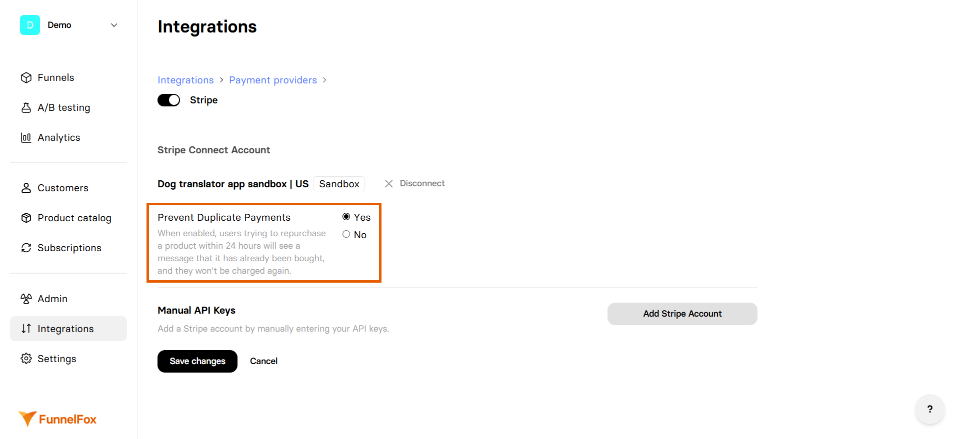 Users sometimes double-click purchase buttons accidentally. By default, if this happens before Stripe confirms the payment to FunnelFox, it creates a duplicate charge. To enable duplicate payment protection:- Go to Integrations > Stripe.