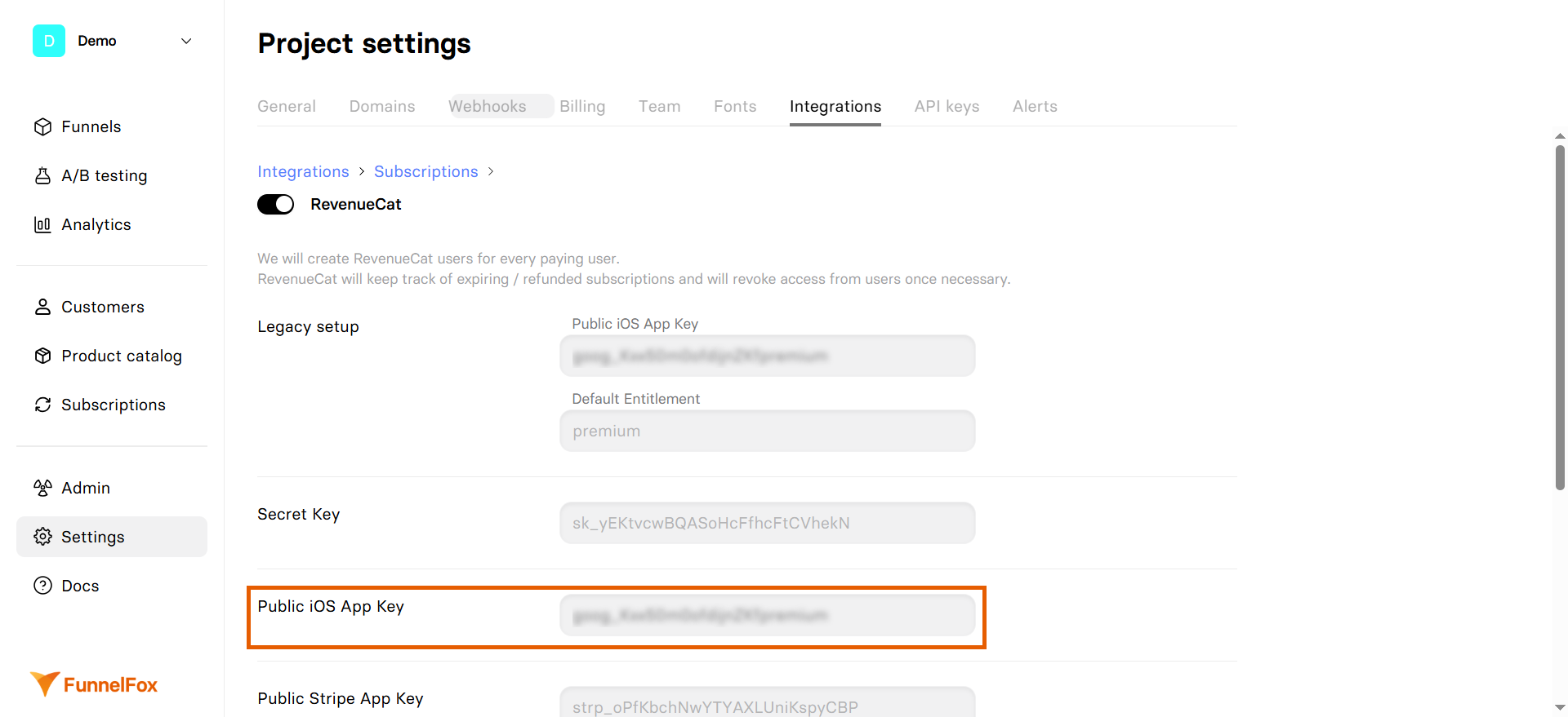 - Go to Settings > Integrations > RevenueCat in FunnelFox.