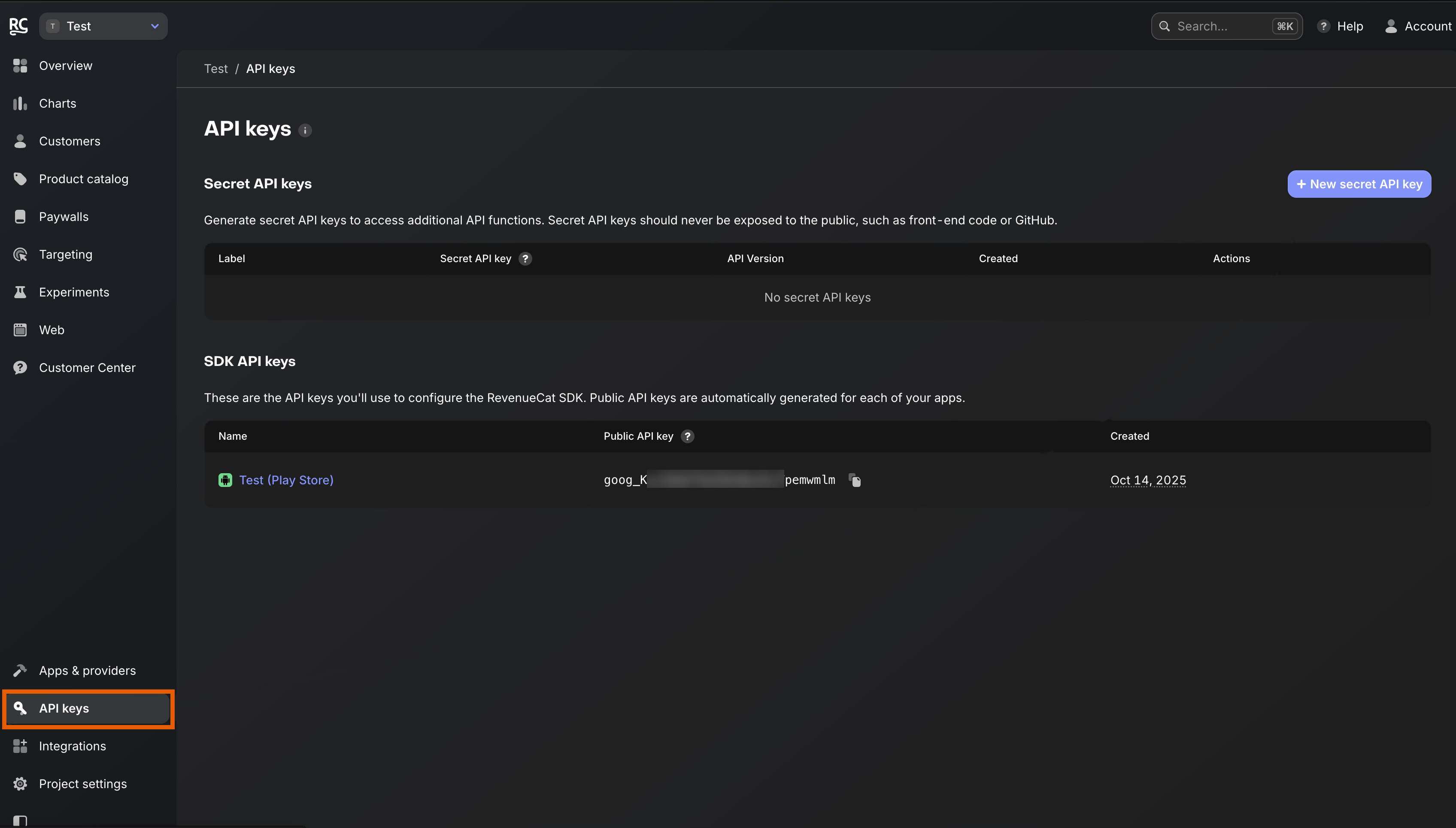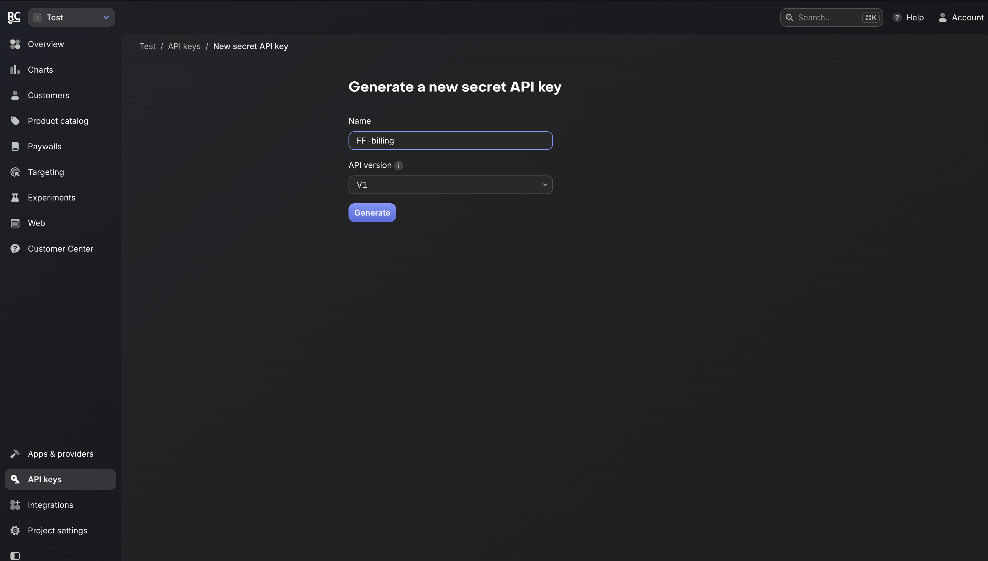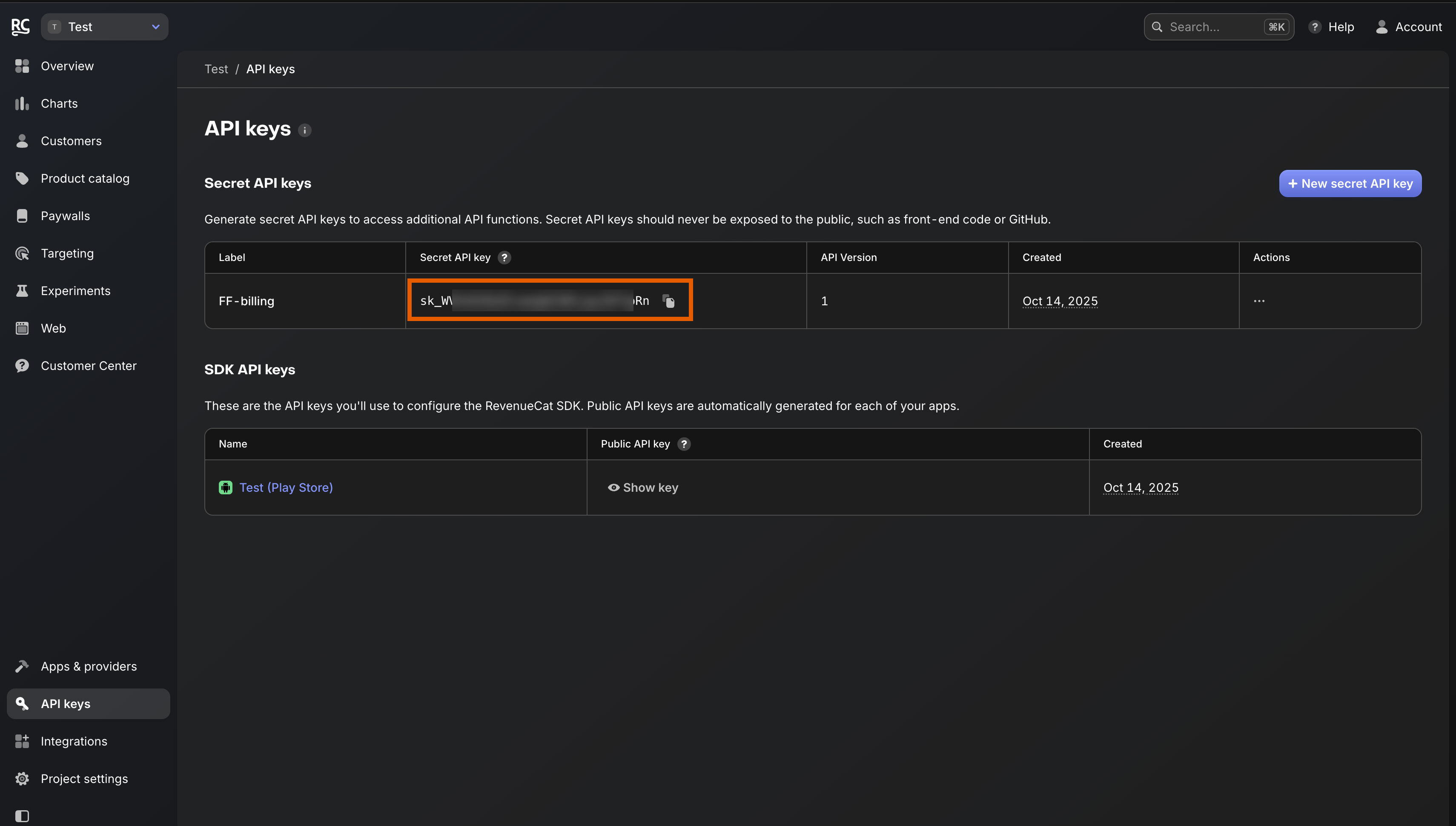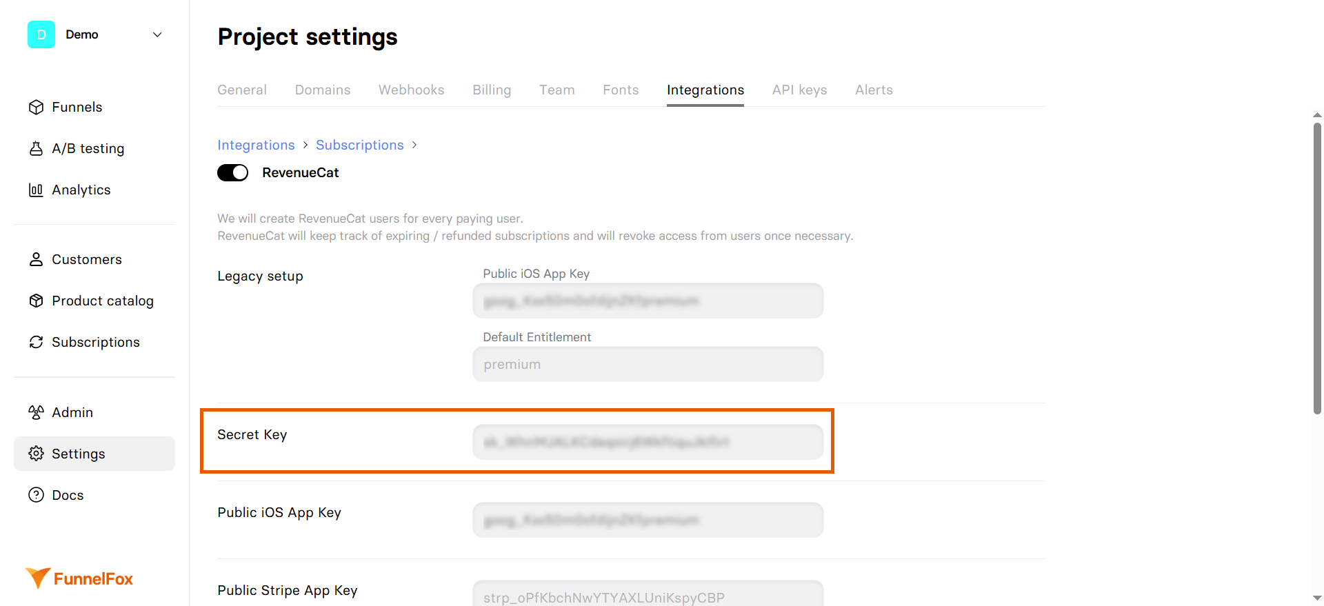 - Go back to RevenueCat settings in FunnelFox and paste the key into the Secret Key field.