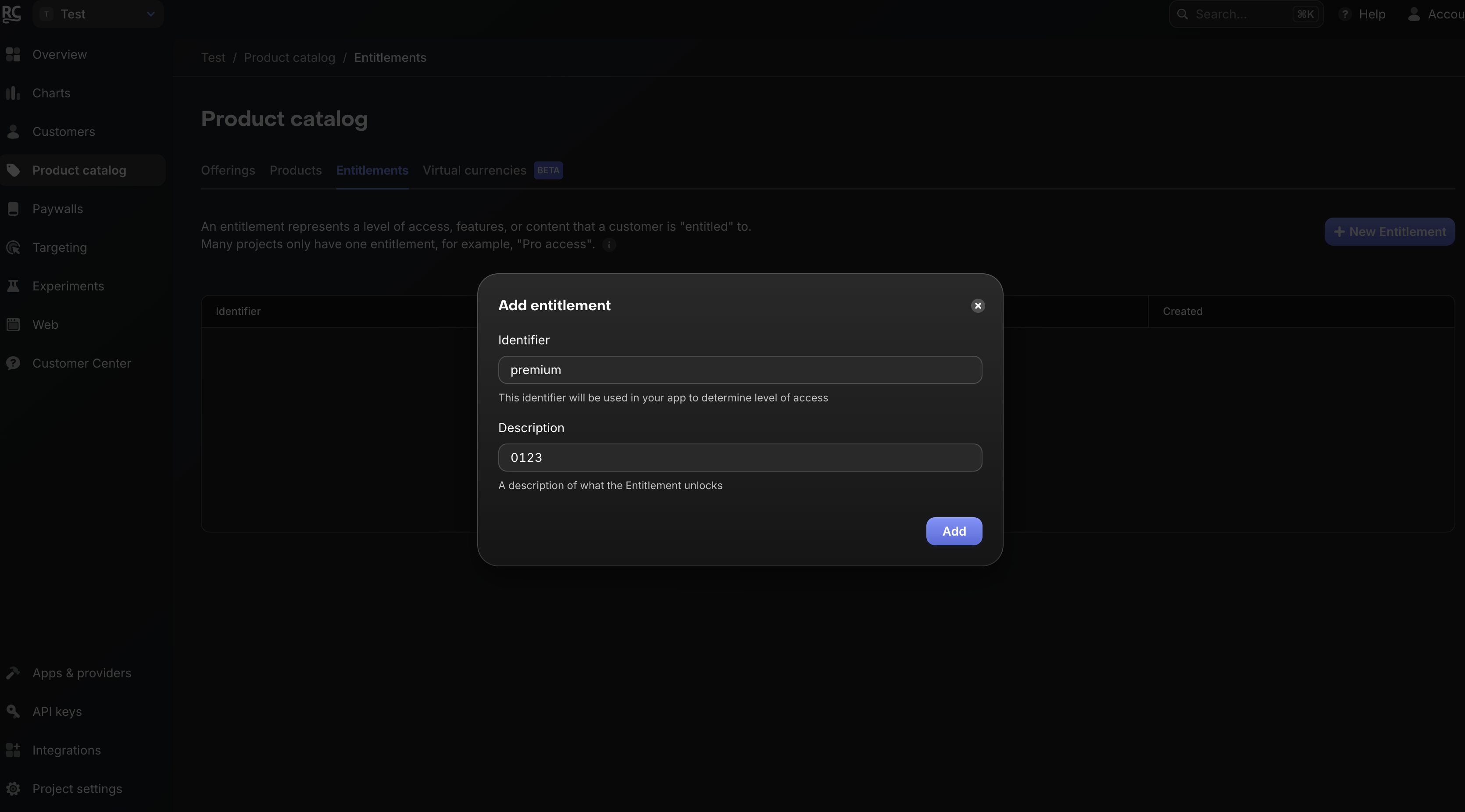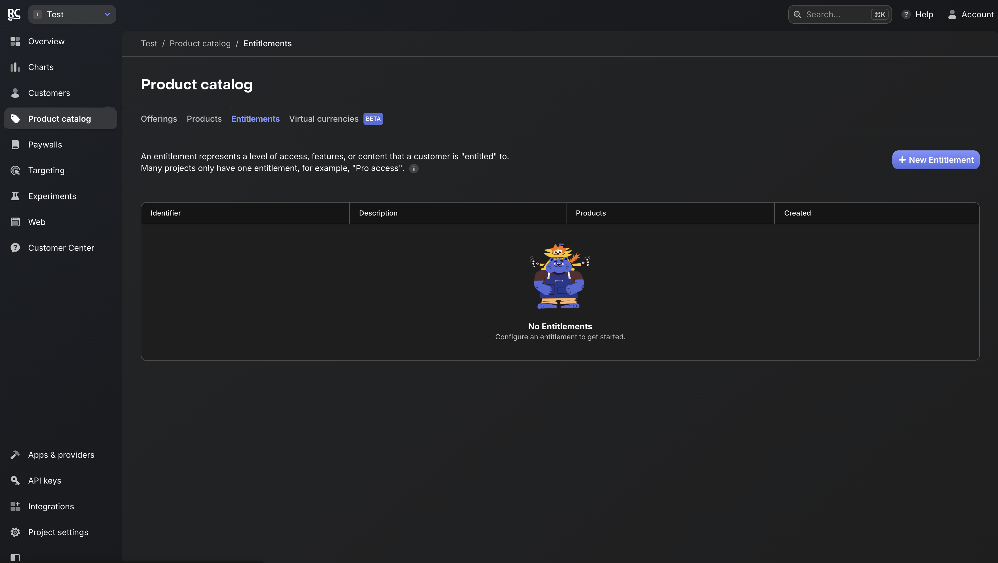- In your RevenueCat project, go to Product catalog > Entitlements.