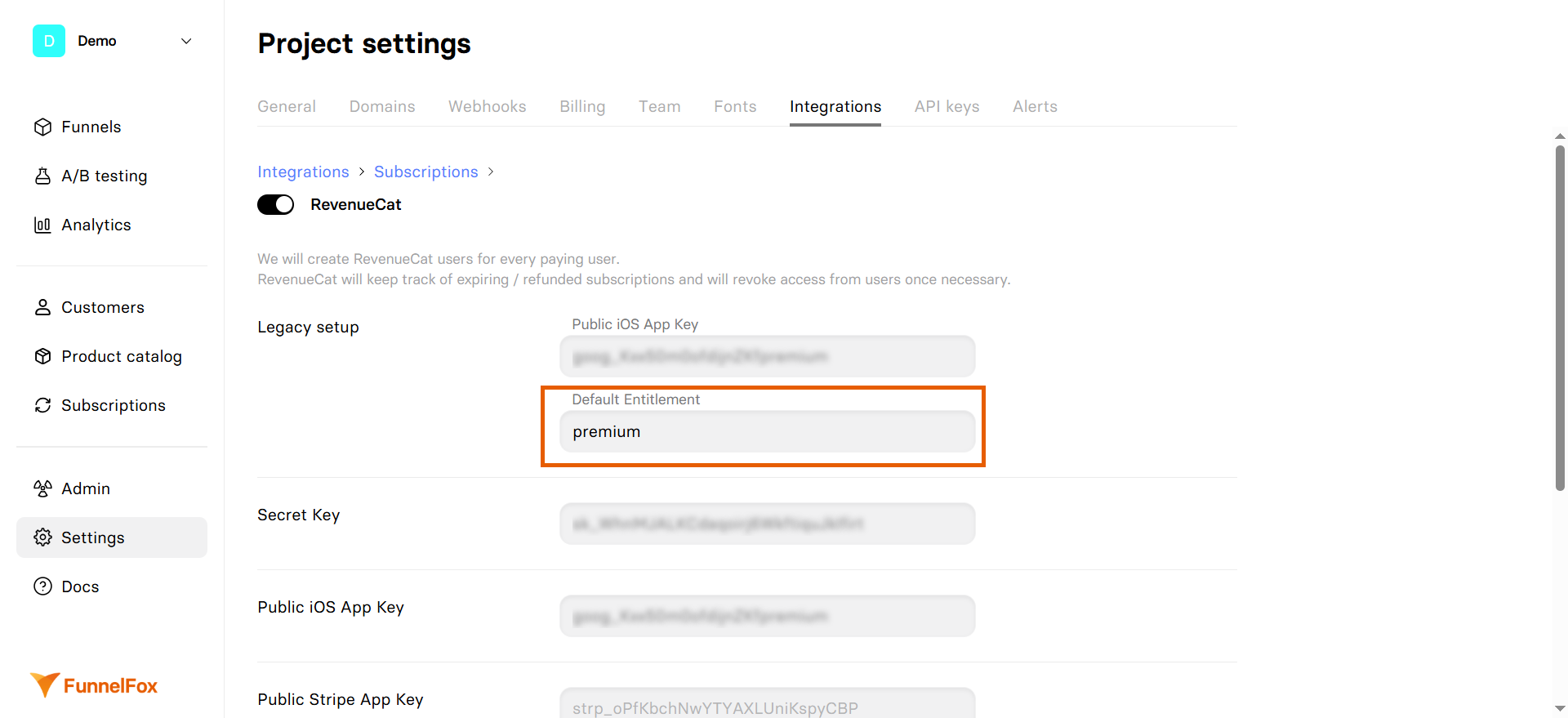 - Go back to RevenueCat settings in FunnelFox and enter the same identifier value